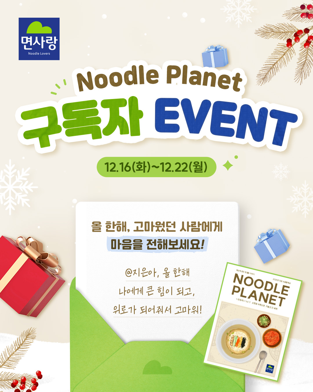 올 한해, 고마웠던 사람에게 정성스럽게 뽑아낸 소면처럼 따뜻한 마음 한 줄을 전해주세요!